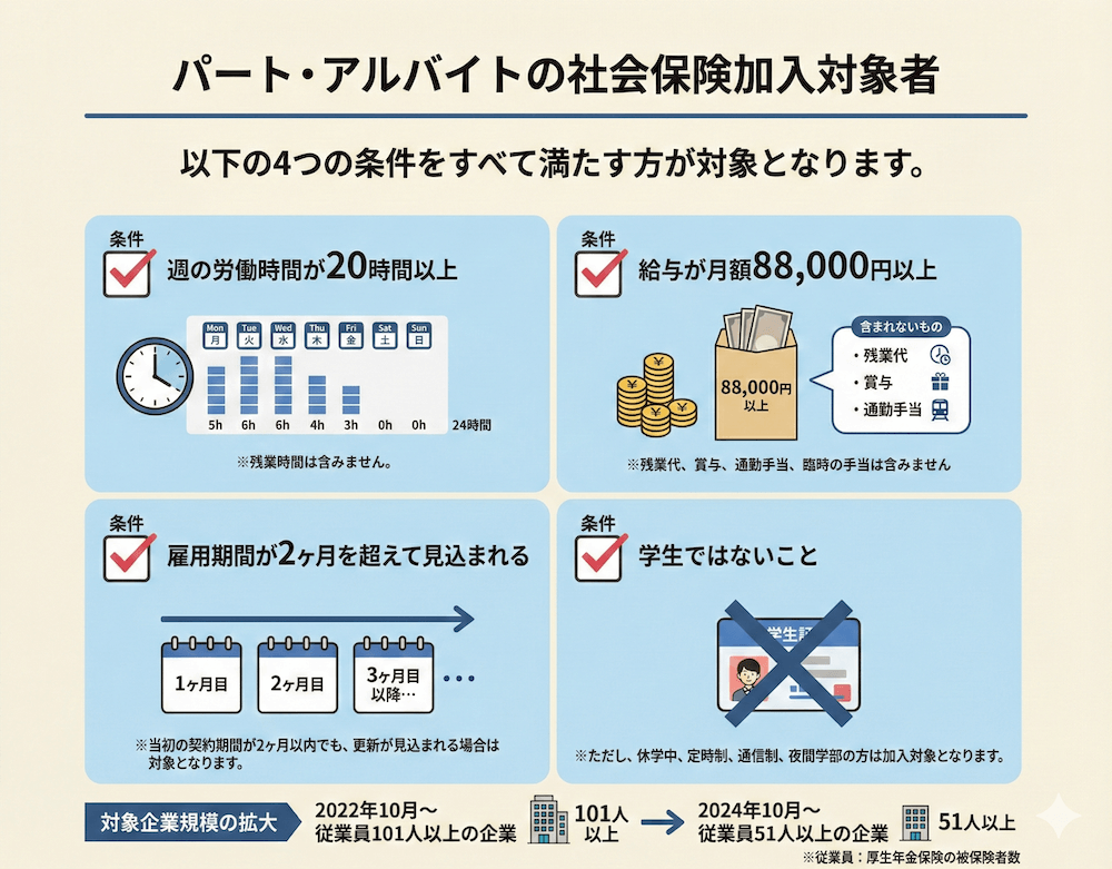 パート・アルバイトであっても、働き方によっては社会保険の加入対象になります。