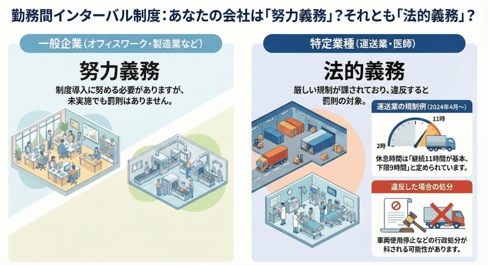 勤務間インターバル制度は、業種によって法律上の扱いが大きく異なります。
