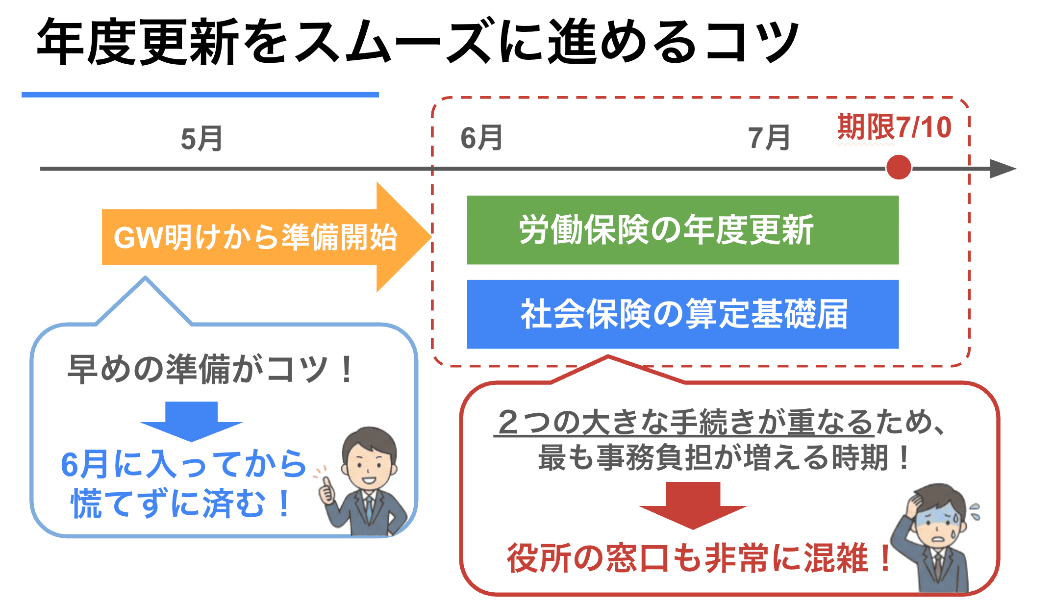おすすめの着手時期は、5月のゴールデンウィーク明けです。この時期から昨年度の賃金台帳を揃え、確定保険料と概算保険料の計算を済ませておくと安心です。