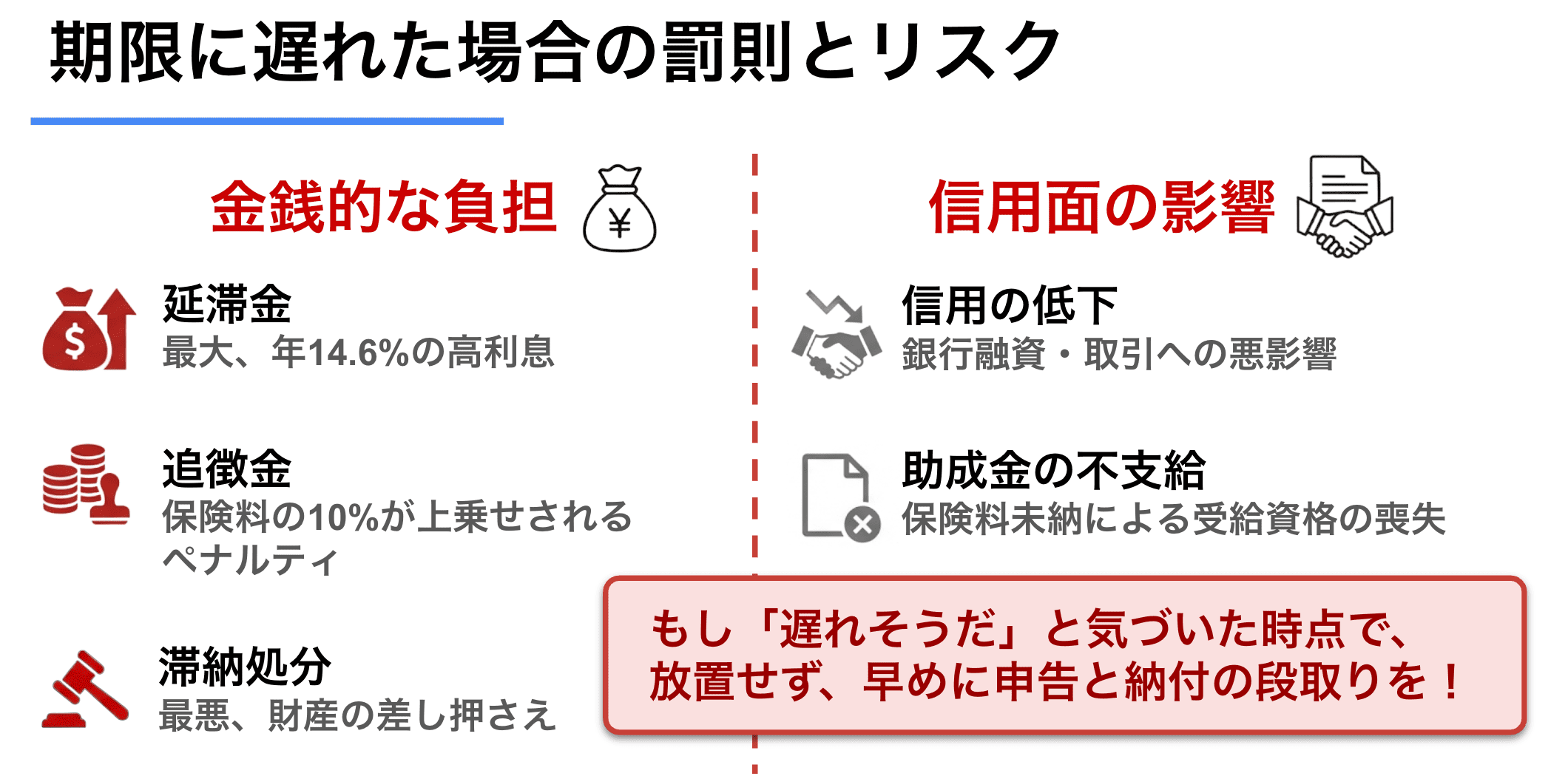 労働保険の年度更新を期限内に行わない場合、事業主にはさまざまなペナルティが発生する可能性があります。