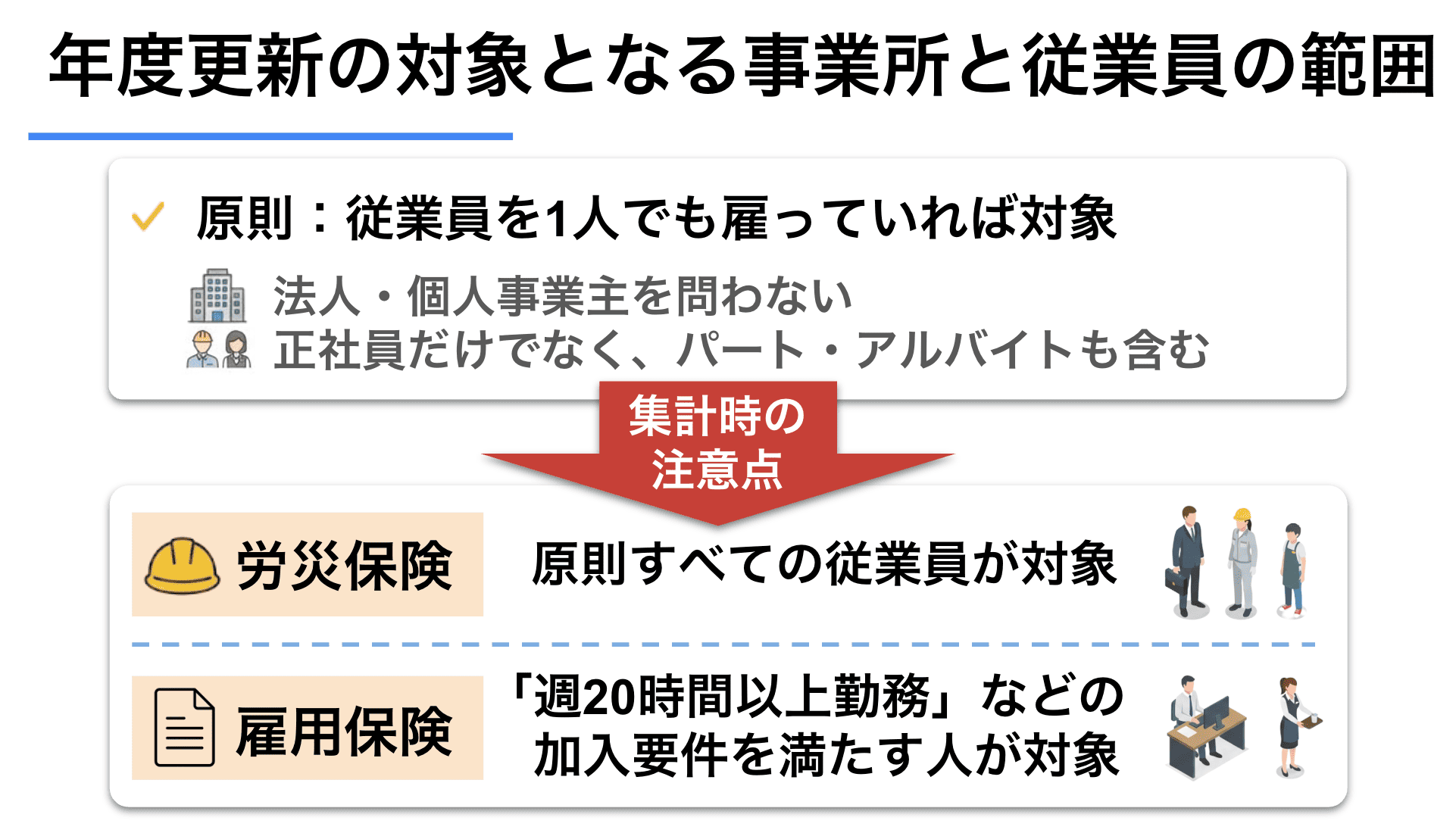 ただし、労災保険と雇用保険では対象者の考え方が異なります。労災保険は原則としてすべての労働者が対象ですが、雇用保険は週20時間以上勤務するなど、加入要件を満たす被保険者が対象です。