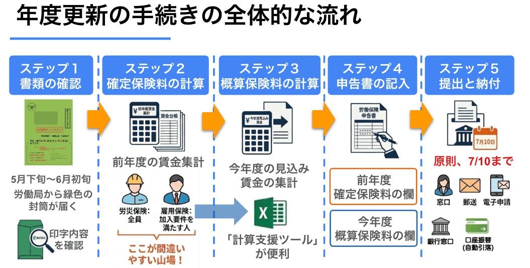 年度更新の手続きは、主に以下の5つのステップに分けられます。