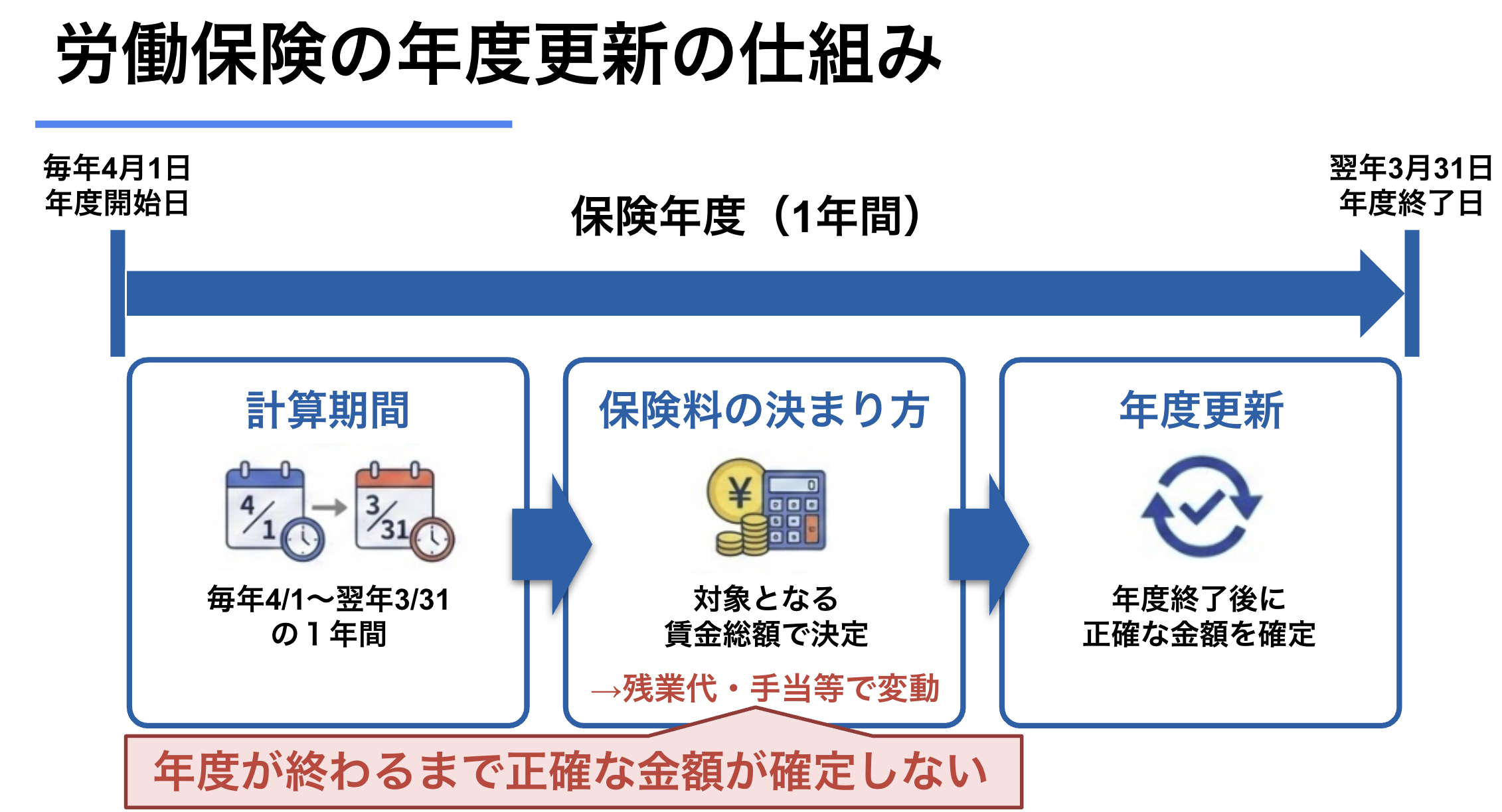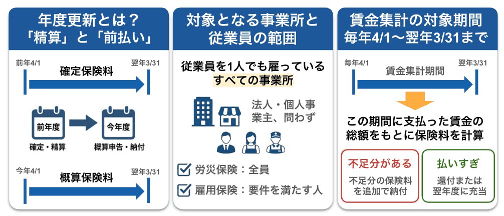 年度更新の対象期間は、前年度の4月1日から3月31日までです。この期間に支払われた賃金を基に確定保険料が算出されます。