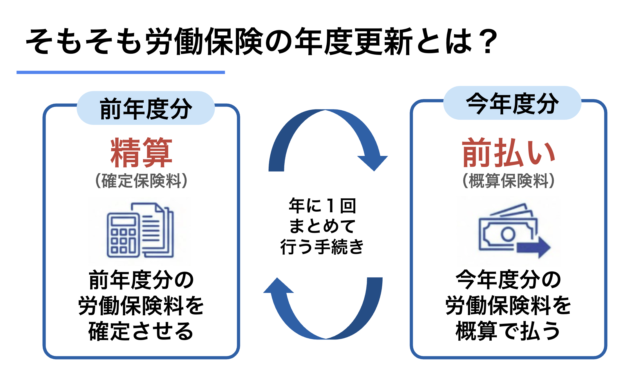 確定保険料とは、前年度に実際に支払った賃金総額をもとに計算する労働保険料です。一方、概算保険料とは、新年度に支払う予定の賃金総額をもとに計算する見込みの保険料です。